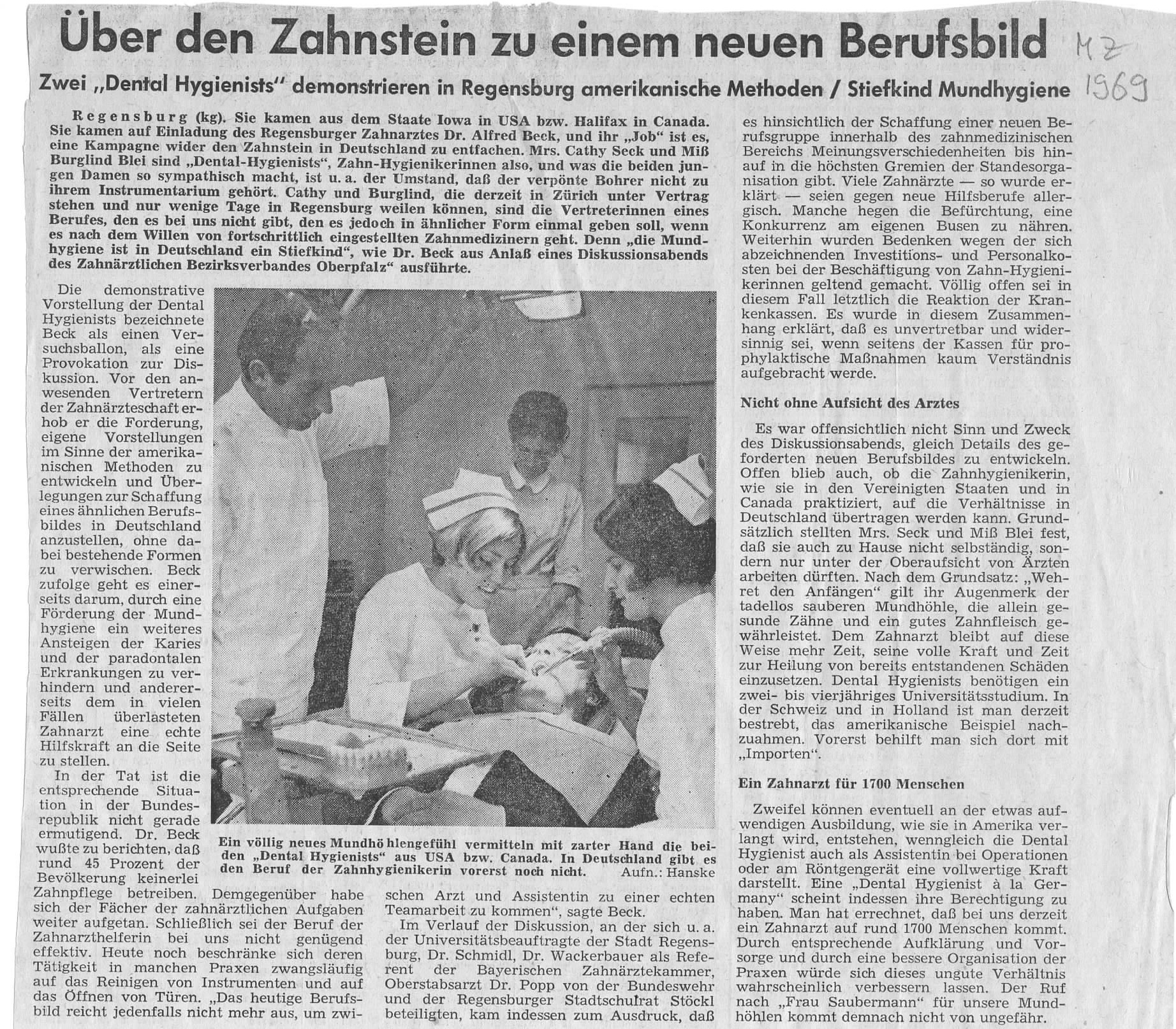 Die Praxis Dr. Beck hat bereits 1969 in einem Pilotprojekt Dentalhygienikerinnen aus Amerika nach Regensburg geholt. Dieses Novum hat für Furore gesorgt und zu einer ganzseitigen Berichterstattung in der Mittelbayerischen Zeitung.